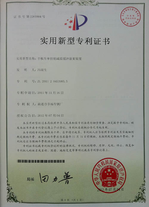 平板車單排輪減震緩沖懸架裝置專利證書